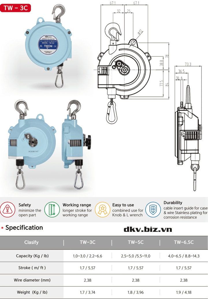 - Trọng lượng pa lăng cân bằng Tigon TW-6.5C tiêu chuẩn: 1.9 kg.