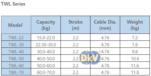 - Pa lăng cân bằng Tigon TWL-22, Tigon Sring balancer TWL-22: là loại pa lăng cân bằng hay còn gọi (Pa lăng lò xo tự rút) của hãng Tigon thuộc dòng series TWL, có sức nâng từ: 15 - 22 kg , hành trình: 2.2 m, đường kính cáp: 4.76 mm, chuyên dùng để treo các loại súng hoặc vật dụng trong nhà xưởng, cần thao tác nhanh.