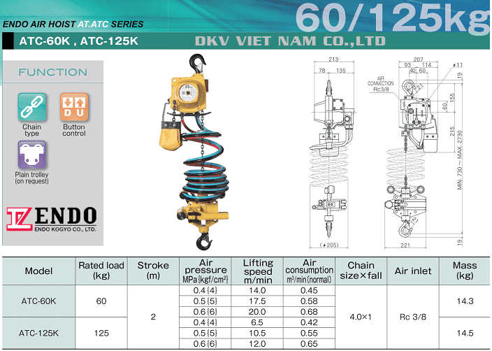 - Pa lăng xích khí nén Endo ATC-60K được sản xuất bởi Endo Kogyo. Co., Ltd - Niigata - Japan. Made in Japan (CO Phòng thương mại Osaka | Japan). DKV VIET NAM CO.,LTD nhập khẩu trực tiếp từ Nhật Bản và phân phối service.