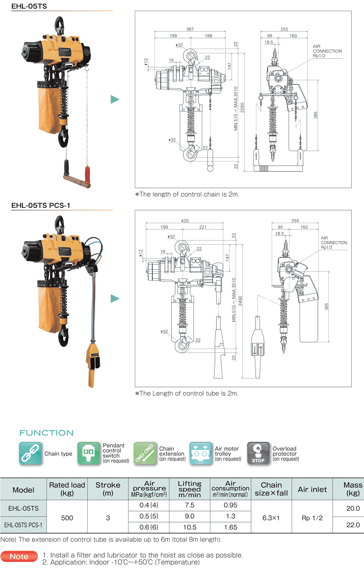 - Pa lăng xích khí nén Endo EHL-05TS, trang bị 1 đường xích tải, xích tải được chế tạo từ thép hợp kim, đường kính đốt xích tải Ø 6.3 mm, chế tạo theo tiêu chuẩn ISO3077-1984 chất lượng độ chính xác cao, đảm bảo khả năng chịu tải lớn. Ngoài chiều cao nâng tiêu chuẩn 3 m, có thể chọn lựa cable tải có hành trình nâng cao hơn để phù hợp với nhu cầu của khách hàng (Option).