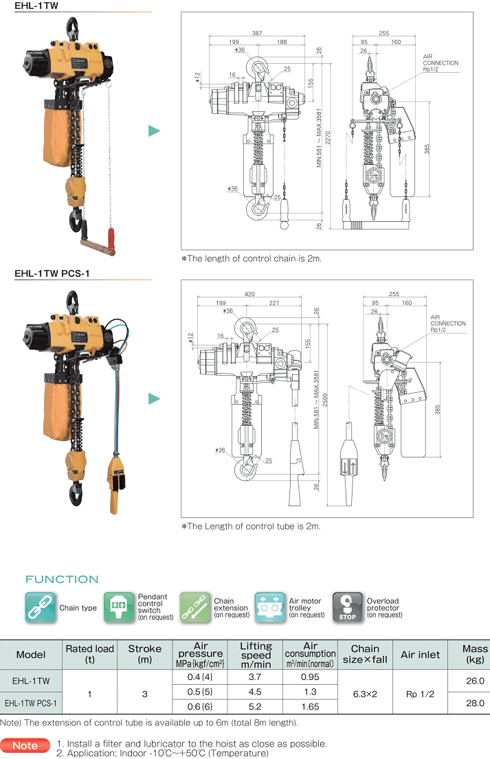 - Pa lăng xích khí nén Endo EHL-1TW sử dụng động khí nén: lưu lượng khí đạt 0.95 ÷ 1.65 m3/phút, áp khí nén đầu vào: 4 - 6 bar, đường ống dẫn khí: 12.7 mm (1/2"), ren coupler khí nén: Rc-1/2", nâng hạ với dải vận tốc nâng: 3.7 ÷ 5.2 m/phút , đảm bảo nâng hạ mượt mà, thông qua điều khiển dạng dây kéo tay tác động vào công tắc nâng | hạ trên động cơ khí nén (up/down | lên/xuống).