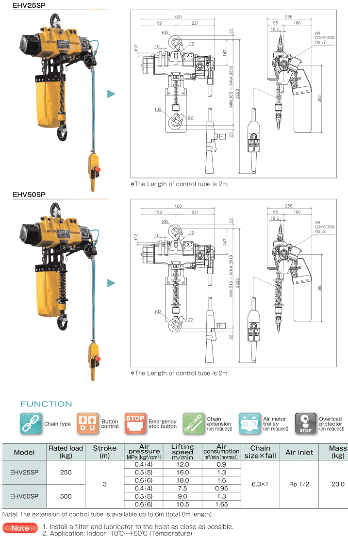 - Pa lăng xích khí nén Endo EHV25SP sử dụng động khí nén: lưu lượng khí đạt 0.9 ÷ 1.6 m3/phút, áp khí nén đầu vào: 4 - 6 bar, đường ống dẫn khí: 12.7 mm (1/2"), ren coupler khí nén: Rc-1/2", nâng hạ với dải vận tốc nâng: 12 ÷ 18 m/phút , đảm bảo nâng hạ mượt mà, thông qua điều khiển cầm tay với 2 nút (up/down | lên/xuống) và nút dừng khẩn cấp.
