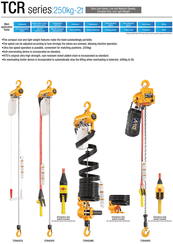 - Pa lăng xích khí nén Kito TCRH03CS, Kito peumatic chain hoists TCRH03CS: là loại pa lăng xích sử dụng khí nén của hãng Kito | Japan (Made in Japan) thuộc dòng series TCR, có sức nâng max: 0.25 tấn, giới hạn thử tải: 0.313 tấn, tốc độ nâng khi có tải max: 9 m/phút, tốc độ hạ tải max: 17.4 m/phút, chiều cao nâng hạ tiêu chuẩn: 3 m, sử dụng rộng rãi trong công nghiệp nâng hạ, do có tính cơ động cao.