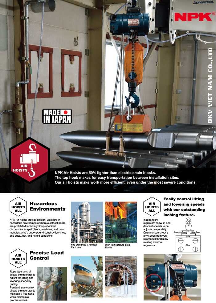 - Pa lăng xích khí nén NPK RHL-250P được sản xuất bởi Nippon Pneumatic Mfg. Co., Ltd - Osaka - Japan. Made in Japan (CO Phòng thương mại Osaka | Japan). DKV VIET NAM CO.,LTD nhập khẩu trực tiếp từ Nhật Bản và phân phối service.