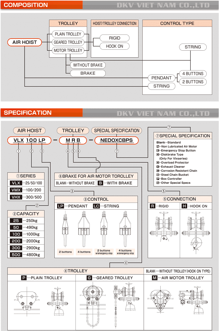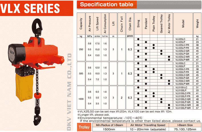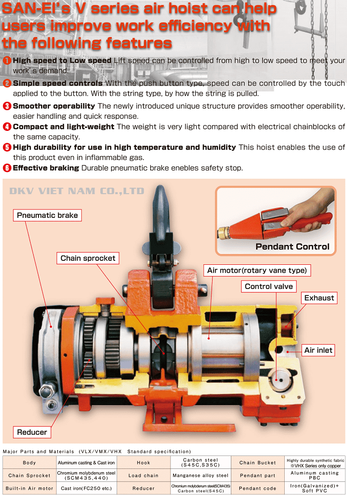 - Pa lăng xích khí nén SAN-EI VLX25LC được sản xuất bởi SAN-EI SEIKI SEISAKUSHO CO., LTD - Fukushima - Japan. Made in Japan (CO Phòng thương mại Osaka | Japan). DKV VIET NAM CO.,LTD nhập khẩu trực tiếp từ Nhật Bản và phân phối service.