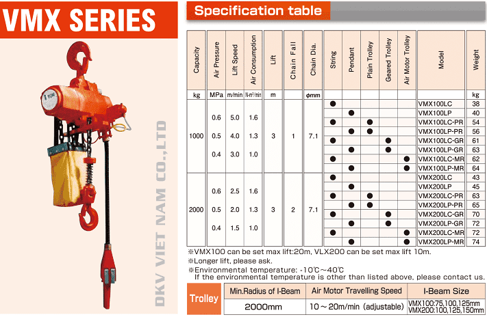 - Pa lăng xích khí nén SAN-EI VMX100LC sử dụng động khí nén: lưu lượng khí đạt 1 - 1.6 m3/phút, áp khí nén đầu vào max: 4 - 6 bar, đường ống dẫn khí: 12.7 mm (1/2"), ren coupler khí nén: Rc-3/8", cho nâng hạ với vận tốc nâng: 3 - 5 m/phút (khi nâng tải), đảm bảo nâng hạ mượt mà, thông qua điều khiển dạng dây kéo tay tác động vào công tắc nâng | hạ trên động cơ khí nén (up/down | lên/xuống).