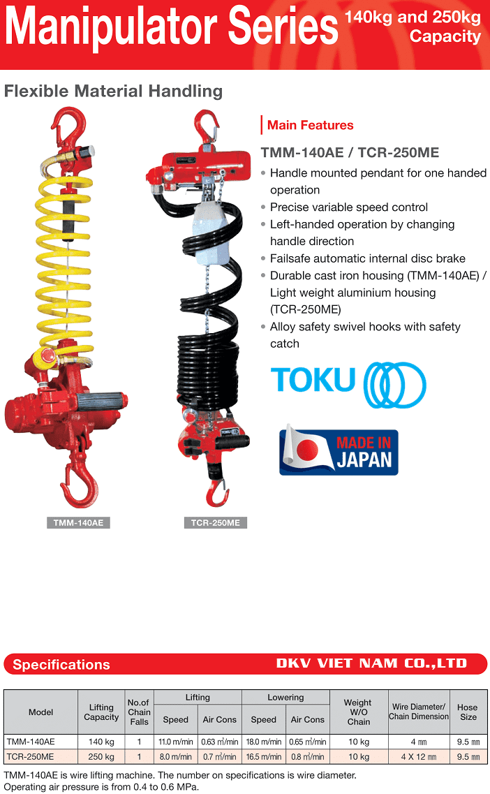 - Pa lăng xích khí nén Toku TCR-250ME được sản xuất bởi Toku Pneumatic Co., Ltd - Tokyo - Japan. Made in Japan (CO Phòng thương mại Osaka | Japan). DKV VIET NAM CO.,LTD nhập khẩu trực tiếp từ Nhật Bản và phân phối service.