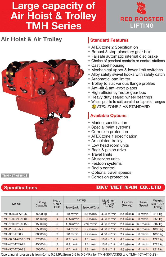 - Pa lăng xích khí nén Toku TMH-9000/3-AT10S được sản xuất bởi Toku Pneumatic Co., Ltd - Tokyo - Japan. Made in Japan (CO Phòng thương mại Osaka | Japan). DKV VIET NAM CO.,LTD nhập khẩu trực tiếp từ Nhật Bản và phân phối service.