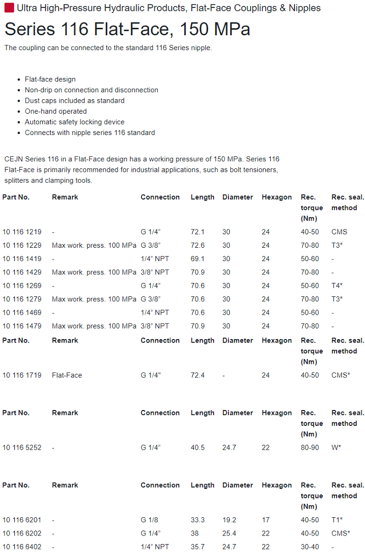 - Coupler Cejn Series 116 Flat-Face, đầu kết nối Cejn Series 116 Flat-Face, Cejn Couplings & nipples Series 116 Flat-Face: là đầu kết nối được chế tạo bằng Zinc plated steel, chống rung, kết nối với các loại bơm tay, bơm điện, bơm khí nén, bơm cao áp.