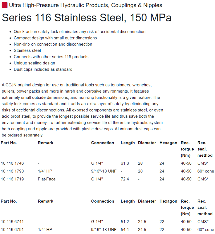 - Coupler Cejn Series 116 STAINLESS STEEL có đường kính ØD: 28 mm, chân kết nối (1/4 " NPT, 9/16"- 18 UNF), được sản xuất bởi Cejn Group - Thụy điển.
