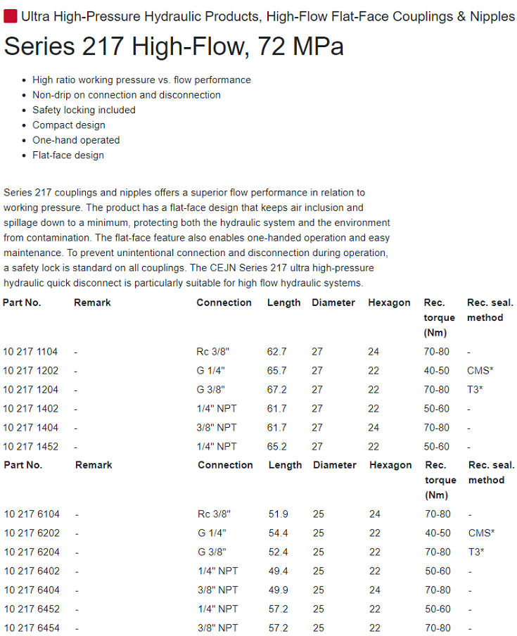 - Coupler Cejn Series 217 High-Flow có đường kính ØD: 25-27 mm, chân kết nối (1/4 " NPT, 3/8" NPT, G 1/4", G 3/8"), được sản xuất bởi Cejn Group - Thụy điển.