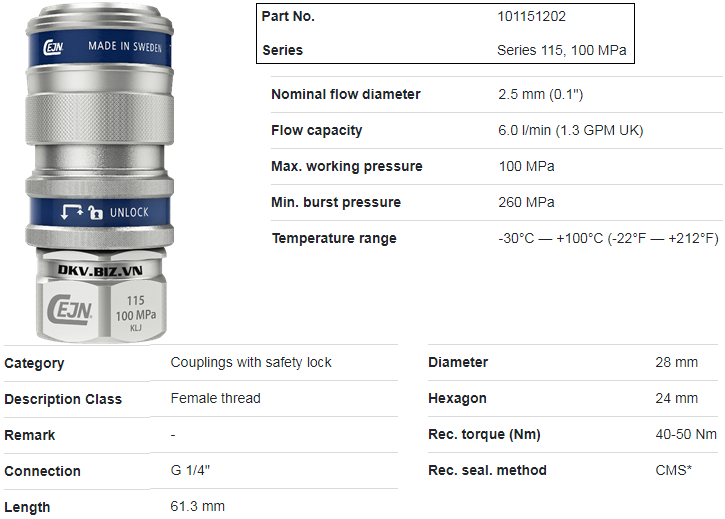 - Coupler thủy lực cao áp Cejn 101151202, Cejn female hydraulic high pressure 101151202: thuộc dạng khớp nối thủy lực nối nhanh (cắm/rút) đặc chủng, có dải áp hoạt động < 100 MPa (1.000 bar), chuyên sử dụng kết nối tạo áp cho tháo/lắp các mối ghép chặt không ren, căng bulong thủy lực và thiết bị thủy lực cao áp khác.