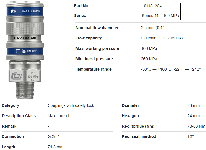 - Vật liệu chế tạo coupler thủy lực cao áp Cejn 101151254 là thép hợp kim phủ mạ đen, vòng đệm là NBR (cao su kháng dầu), cho phép đạt giới hạn nổ max: 260 MPa (2.600 bar).