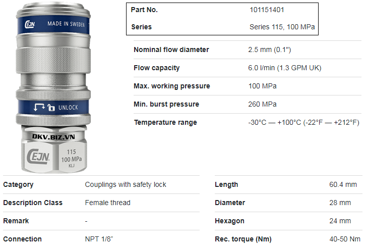 - Vật liệu chế tạo coupler thủy lực cao áp Cejn 101151401 là thép hợp kim phủ mạ đen, vòng đệm là NBR (cao su kháng dầu), cho phép đạt giới hạn nổ max: 260 MPa (2.600 bar).