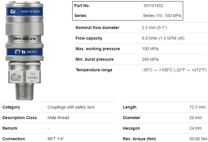 - Vật liệu chế tạo coupler thủy lực cao áp Cejn 101151452 là thép hợp kim phủ mạ đen, vòng đệm là NBR (cao su kháng dầu), cho phép đạt giới hạn nổ max: 260 MPa (2.600 bar).