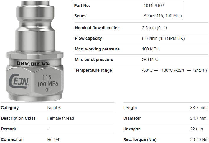 - Vật liệu chế tạo coupler thủy lực cao áp Cejn 101156102 là thép hợp kim phủ mạ đen, vòng đệm là NBR (cao su kháng dầu), cho phép đạt giới hạn nổ max: 260 MPa (2.600 bar).