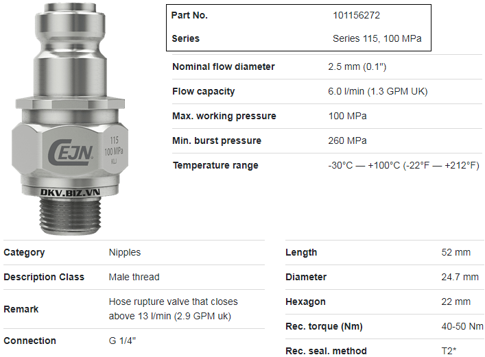- Vật liệu chế tạo coupler thủy lực cao áp Cejn 101156272 là thép hợp kim phủ mạ đen, vòng đệm là NBR (cao su kháng dầu), cho phép đạt giới hạn nổ max: 260 MPa (2.600 bar).