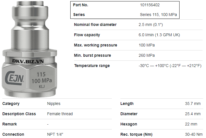 - Vật liệu chế tạo coupler thủy lực cao áp Cejn 101156402 là thép hợp kim phủ mạ đen, vòng đệm là NBR (cao su kháng dầu), cho phép đạt giới hạn nổ max: 260 MPa (2.600 bar).