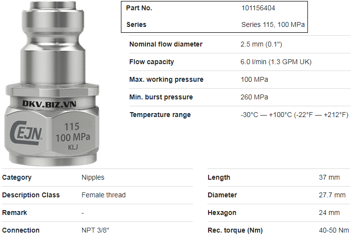 - Vật liệu chế tạo coupler thủy lực cao áp Cejn 101156404 là thép hợp kim phủ mạ đen, vòng đệm là NBR (cao su kháng dầu), cho phép đạt giới hạn nổ max: 260 MPa (2.600 bar).