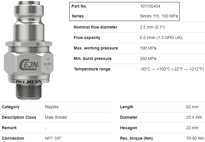 - Vật liệu chế tạo coupler thủy lực cao áp Cejn 101156454 là thép hợp kim phủ mạ đen, vòng đệm là NBR (cao su kháng dầu), cho phép đạt giới hạn nổ max: 260 MPa (2.600 bar).