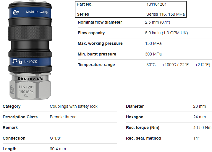 - Coupler thủy lực cao áp Cejn 101161201, Cejn female hydraulic high pressure 101161201: thuộc dạng khớp nối thủy lực nối nhanh (cắm/rút) đặc chủng, có dải áp hoạt động < 150 MPa (1.500 bar), chuyên sử dụng kết nối tạo áp cho tháo/lắp các mối ghép chặt không ren, căng bulong thủy lực và thiết bị thủy lực cao áp khác.