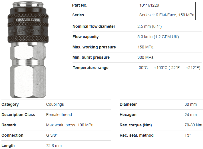 - Coupler thủy lực cao áp Cejn 101161229, Cejn female hydraulic high pressure 101161229: thuộc dạng khớp nối thủy lực nối nhanh (cắm/rút) đặc chủng, có dải áp hoạt động < 150 MPa (1.500 bar), chuyên sử dụng kết nối tạo áp cho tháo/lắp các mối ghép chặt không ren, căng bulong thủy lực và thiết bị thủy lực cao áp khác.