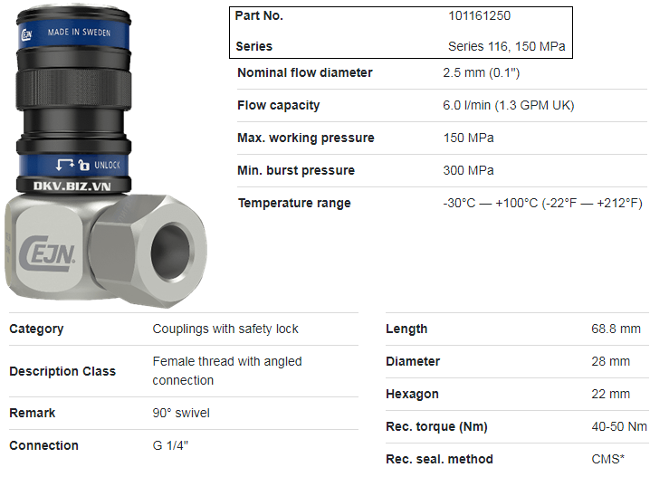 - Vật liệu chế tạo coupler thủy lực cao áp Cejn 101161250 là thép hợp kim phủ mạ đen, vòng đệm là NBR (cao su kháng dầu), cho phép đạt giới hạn nổ max: 300 MPa (3.000 bar).