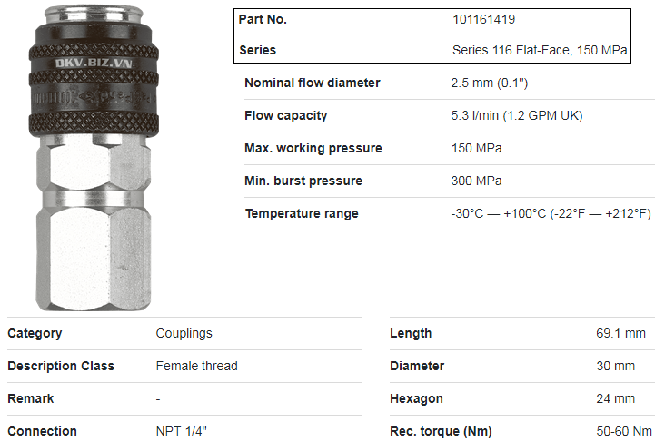 - Vật liệu chế tạo coupler thủy lực cao áp Cejn 101161419 là thép hợp kim thường, vòng đệm là NBR (cao su kháng dầu), cho phép đạt giới hạn nổ max: 300 MPa (3.000 bar).