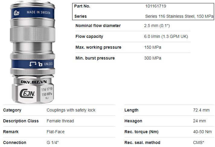 - Vật liệu chế tạo coupler thủy lực cao áp Cejn 101161719 là inox (Stainless Steel), vòng đệm là NBR (cao su kháng dầu), cho phép đạt giới hạn nổ max: 300 MPa (3.000 bar).