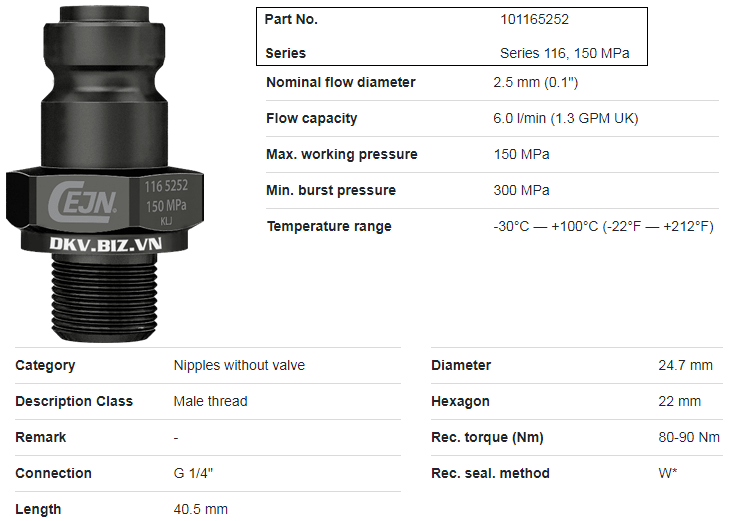 - Coupler thủy lực cao áp Cejn 101165252, Cejn male hydraulic high pressure 101165252: thuộc dạng khớp nối thủy lực nối nhanh (cắm/rút) đặc chủng, có dải áp hoạt động < 150 MPa (1.500 bar), chuyên sử dụng kết nối tạo áp cho tháo/lắp các mối ghép chặt không ren, căng bulong thủy lực và thiết bị thủy lực cao áp khác.