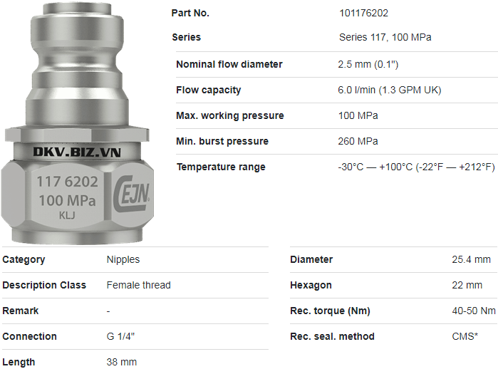- Vật liệu chế tạo coupler thủy lực cao áp Cejn 101176202 là thép hợp kim phủ mạ đen, vòng đệm là NBR (cao su kháng dầu), cho phép đạt giới hạn nổ max: 260 MPa (2.600 bar).