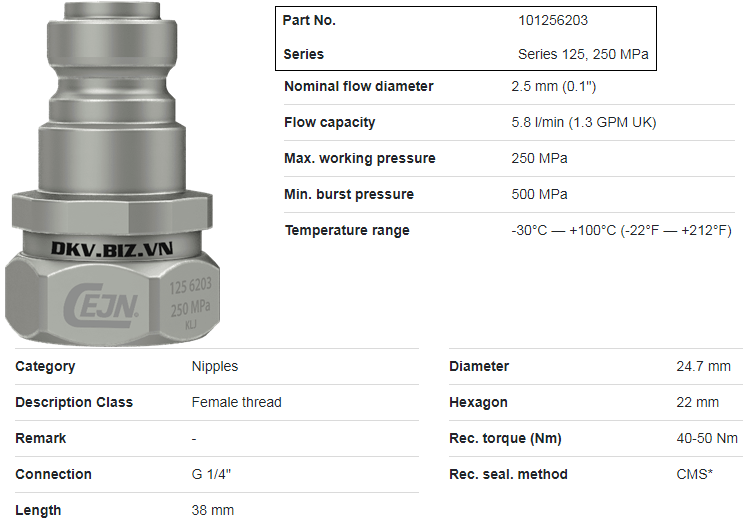 - Coupler thủy lực cao áp Cejn 101256203, Cejn male hydraulic high pressure 101256203: thuộc dạng khớp nối thủy lực nối nhanh (cắm/rút) đặc chủng, có dải áp hoạt động < 250 MPa (2.500 bar), chuyên sử dụng kết nối tạo áp cho tháo/lắp các mối ghép chặt không ren, căng bulong thủy lực và thiết bị thủy lực cao áp khác.