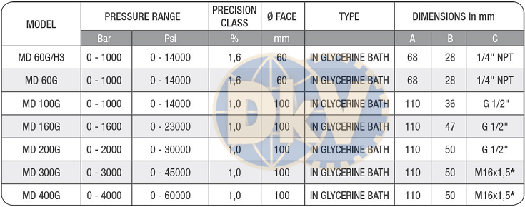 - Đồng hồ áp FPT MD 60G/H3 , áp kế thủy lực FPT MD 60G/H3, FPT pressure gauges MD 60G/H3: là đồng hồ đo áp suất < 1.000 bar (100 Mpa), dùng để đo áp lực dầu thủy lực, chế tạo bằng thép không gỉ, kết nối với các loại bơm tay, bơm điện, bơm khí nén, bơm cao áp.