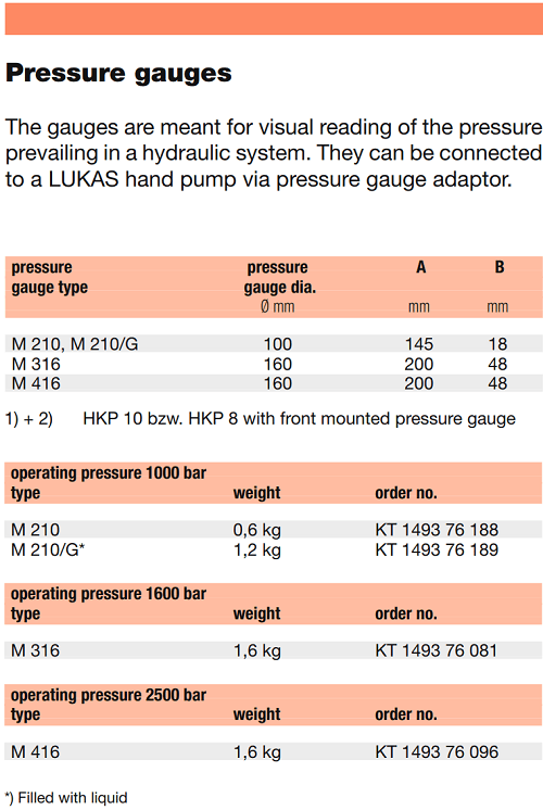 - Đồng hồ áp Lukas M 210, áp kế thủy lực Lukas M 210, Lukas pressure gauges M 210: là đồng hồ đo áp suất < 1.000 bar (100 Mpa), dùng để đo áp lực dầu thủy lực, chế tạo bằng thép không gỉ, kết nối với các loại bơm tay, bơm điện, bơm khí nén, bơm cao áp.