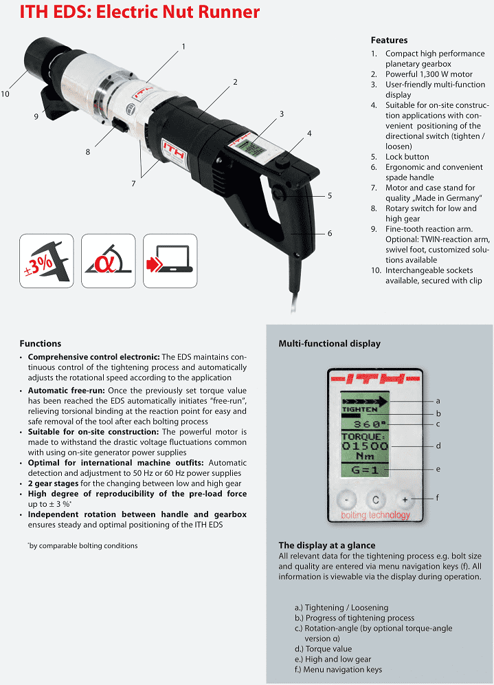 - Súng siết bulong ITH EDS-1300, ITH electric torque wrench EDS-1300: là loại súng siết bulong cài đặt được lực siết theo ý muốn trong dải lực cho phép của súng: 1500 - 13000 N.m, cỡ khẩu bulong: 2-1/2", chuyên dùng để siết lực (moment) chính xác các loại bulong cường độ cao trong công nghiệp.