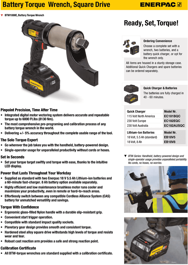 - Súng siết lực bulong pin Enerpac BTW500E, Enerpac cordless battery torque wrench BTW500E: là loại súng siết bulong, cài đặt được lực siết, dùng pin, có lực siết max: 160 - 670 N.m, cỡ khẩu: 3/4", 1 cấp tốc độ, chuyên dùng để siết các loại bulong cường độ cao trong công nghiệp.