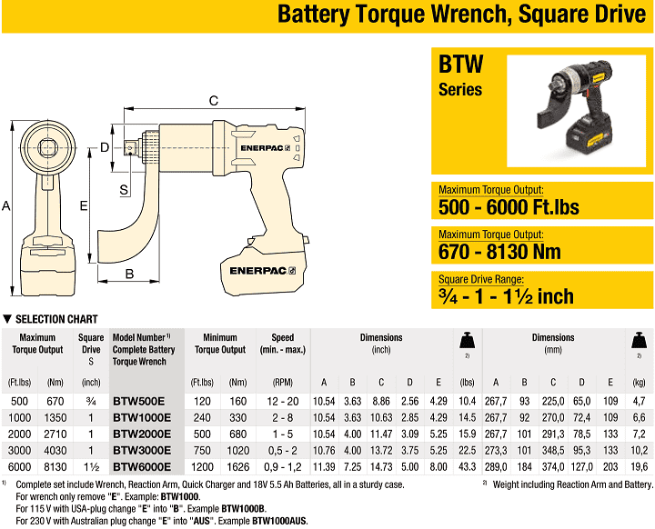 SÚNG SIẾT BULONG PIN ENERPAC BTW500E | ENERPAC BATTERY TORQUE WRENCH BTW500E | 160 - 670 N.m | 3/4"