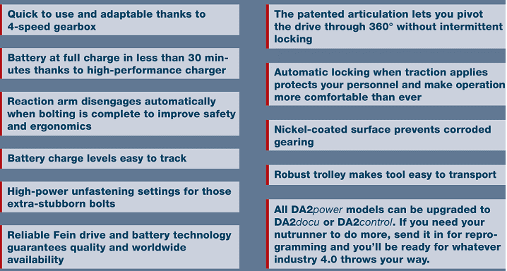 - Việc bảo trì, bảo dưỡng diễn ra nhanh chóng, bởi súng siết bulong Plarad DA2power-20 được tổ hợp từ hai phần tách biệt: động cơ điện và bộ siết lực, đấu nối thông qua khớp bánh răng. Chủ yếu bảo trì phần động cơ điện.