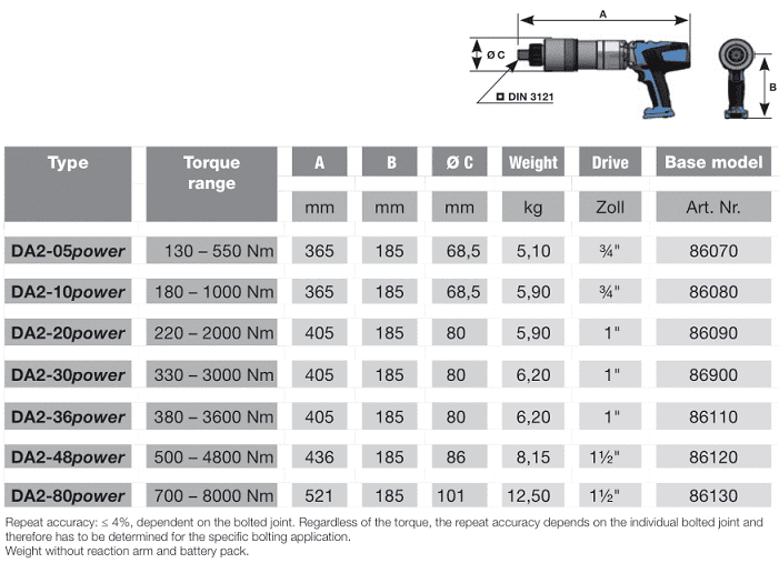 - Súng siết lực pin bulong Plarad DA2power-20, Plarad cordless torque wrench DA2power-20: là loại súng siết bulong, cài đặt được lực siết, dùng pin, có dải lực siết: 220 - 2000 N.m, cỡ khẩu: 1", chuyên dùng để siết các loại bulong cường độ cao trong công nghiệp.