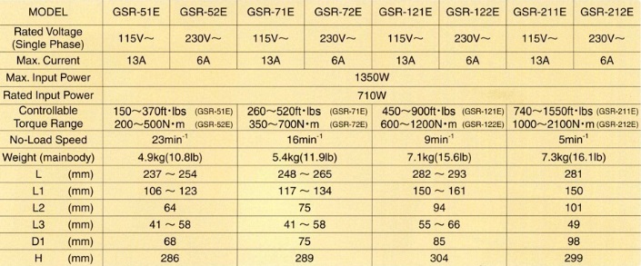 - Súng siết bulong Tone GSR-72E sử dụng điện áp: 230V/50Hz/1ph, công suất: 1.350W/6A.