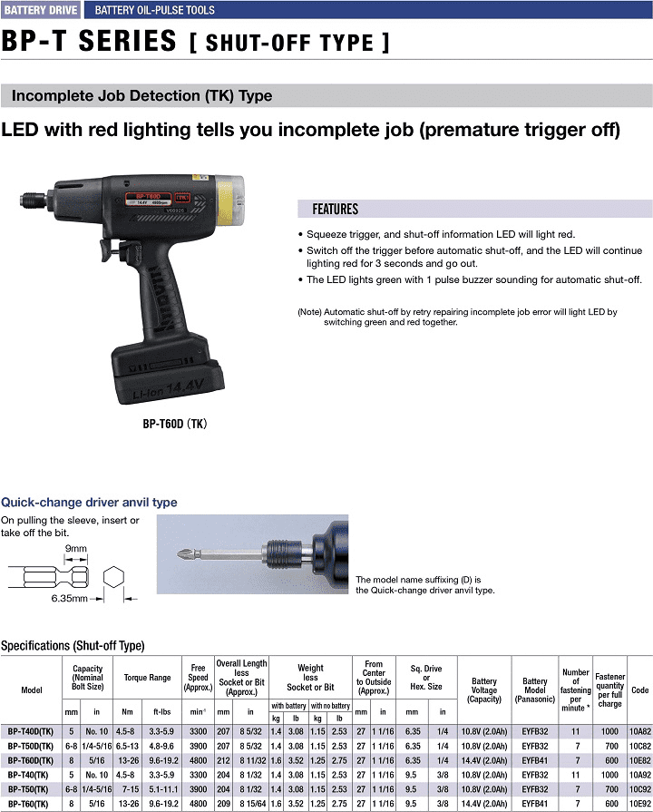 - Súng siết bulong Uryu BP-T50(TK) sử dụng công nghệ pin lithium-ion (18V/2.0 Ah) mới nhất, sặc 200-220V/50Hz/1ph, công nghệ sặc nhanh EY0L82 (Panasonic) (Pin hoặc Bộ sạc pin không được bao gồm).