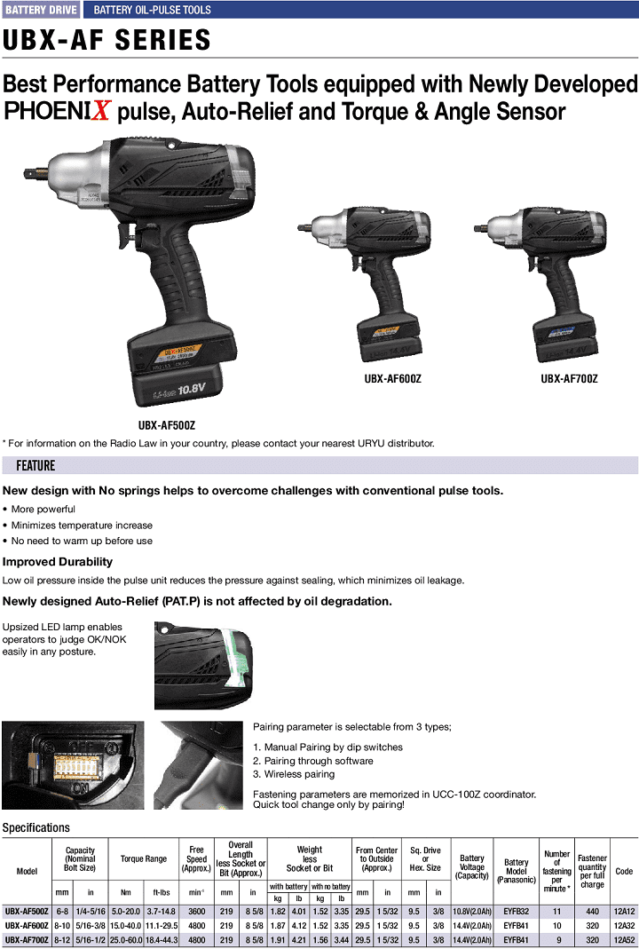 - Súng siết lực Uryu UBX-AF500Z, Súng siết bulong Uryu UBX-AF500Z, Uryu battery tools UBX-AF500Z: là loại súng siết bulong, cài đặt được lực siết, sử dụng pin, có lực siết max: 5 - 20 N.m, cỡ khẩu: 3/8", chuyên dùng để siết các loại bulong trong công nghiệp.