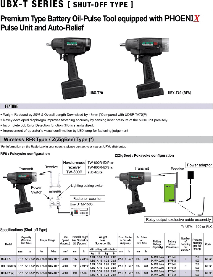 - Súng siết lực Uryu UBX-T70, Súng siết bulong Uryu UBX-T70, Uryu battery tools UBX-T70: là loại súng siết bulong, cài đặt được lực siết, sử dụng pin, có lực siết max: 25 - 55 N.m, cỡ khẩu: 3/8", chuyên dùng để siết các loại bulong trong công nghiệp.