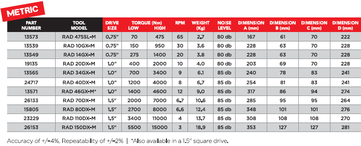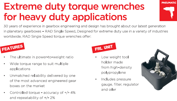 - RAD là hãng chế tạo súng khí nén siết bulong (cài đặt được lực siết) hạng nặng số 1 trên thế giới, chuyên dùng cho công nghiệp nặng, với đặc điểm: độ bền va đập cao, ít sai số tích lũy trong quá trình sử dụng, tuổi thọ dài lâu.