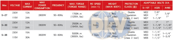 - Sử dụng với 3 size đầu chính, theo tiêu chuẩn S10T (M30, M33 và M36), tiêu chuẩn A325 (1-1/4", 1-1/2" và 1-3/8"), tiêu chuẩn A490 (1-3/8"và 1-1/4"). Thao tác thay đổi đầu xén diễn ra nhanh chóng và đơn giản, nhờ nới và siết chặt các vít phía đầu súng.