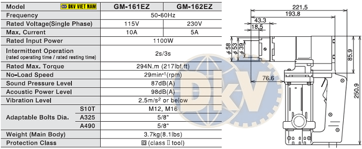 - Súng xén đầu bulong Tone GM-162EZ siết và xén được bulong M12 và M16 theo tiêu chuẩn S10T/Japan với lực siết max: 294 N.m.
