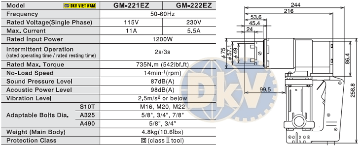 - Súng xén đầu bulong Tone GM-222EZ siết và xén được bulong M16, M20 và M22 theo tiêu chuẩn S10T/Japan với lực siết max: 735 N.m.
