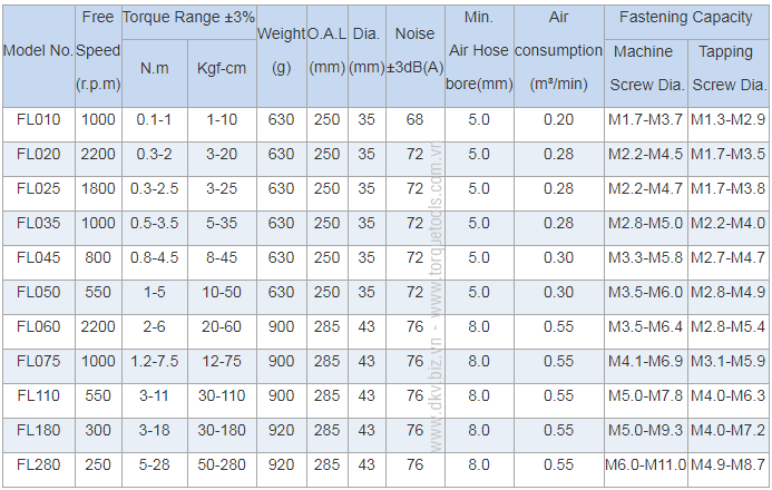 - Tô vít lực khí nén Sumake FL010 có độ ồn: 68 dB, chiều dài: 250 mm, đường kính thân: 35 mm, trọng lượng: 0.63 kg.