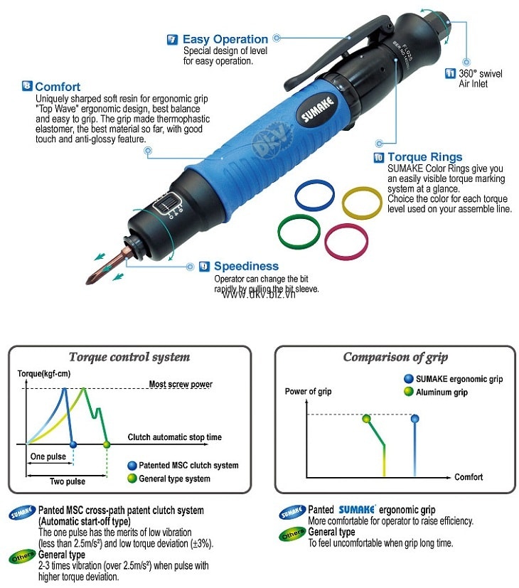 - Tô vít lực khí nén Sumake FL010, Sumake air torque screwdriver FL010 có lực siết: 0.1 - 1 N.m (1 - 10 kgf.cm) chuyên dùng để siết lực chính xác các loại vít tiêu chuẩn Hex.1/4" trong công nghiệp. Tô vít lực điện Sumake FL010 được chế tạo và sản xuất bởi Sumake/Đài Loan .
