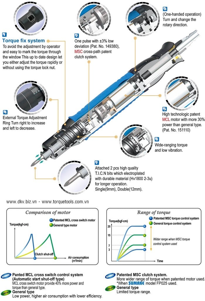 - Tô vít lực khí nén Sumake FL010 sử dụng áp khí nén đầu vào: 6 - 12 bar, với lưu lượng: 0.2 m³/min. Tốc độ vòng quay không tải: 1.000 rpm. Sai số chế tạo đối với lực siết: +/-3%.